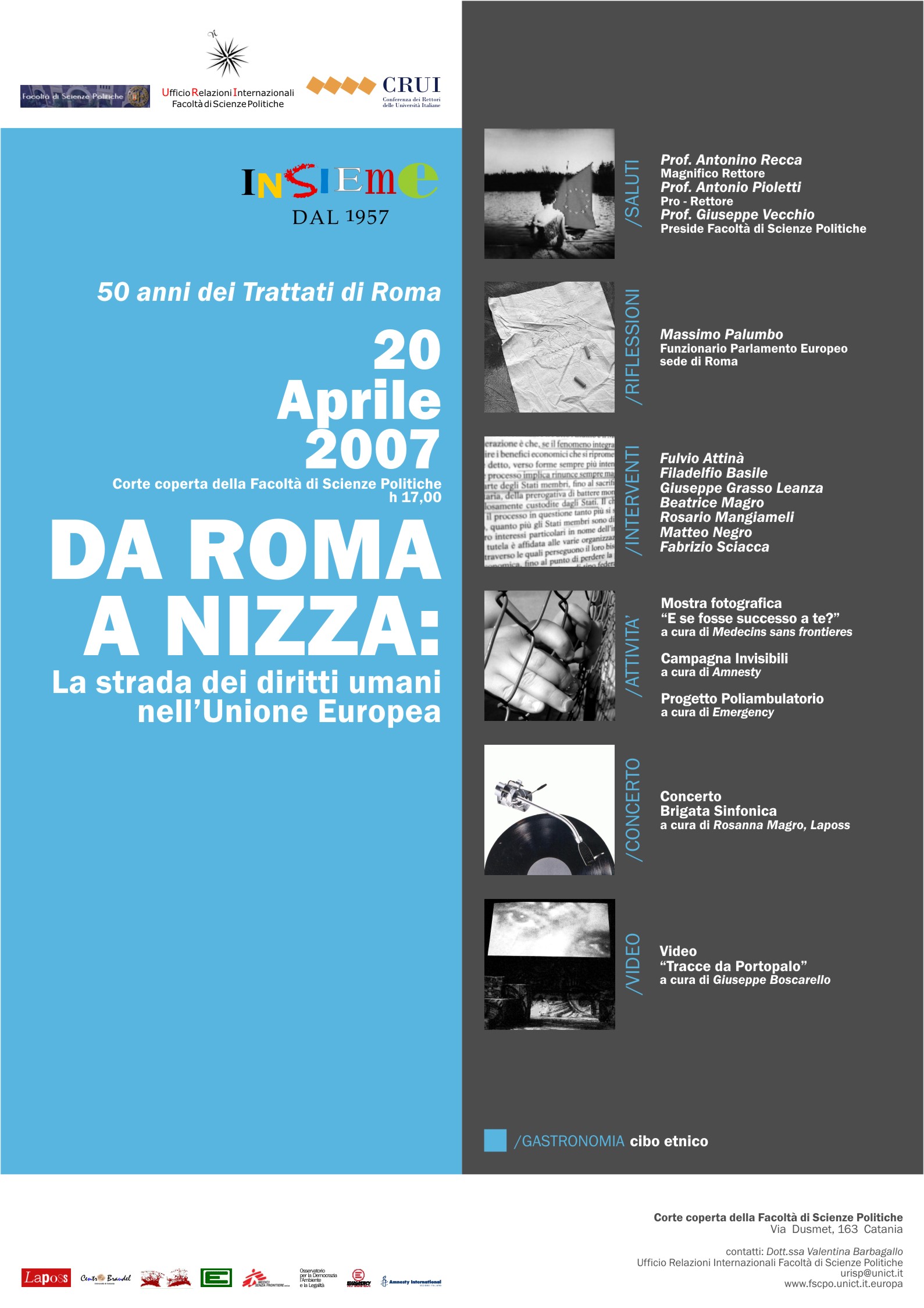 Il cinquantesimo compleano del Trattato di Roma che, il 25 Marzo del 1957, ha istituito la Comunità Economica Europea rappresenta per tutti i cittadini dell’attuale Unione un evento che ha molti motivi per essere festeggiato. Inizia infatti in quella data un processo di sviluppo di un’unione economica e politica che ha determinato la trasformazione di gran parte dell’Europa da campo di guerra tra stati in zona di pace, democrazia, stabilità e prosperità. La manifestazione ha un significato particolare perchè è stata immaginata come momento di riflessione su questo tema sul quale la nostra città, e in particolare la nostra Facoltà che è ospitata nel quartiere della Civita, non può non interrogarsi. La formula che è stata scelta è quella della festa aperta alla città e si articola in vari momenti di comunicazione artistica, musicale e gastronomica. La manifestazione si aprirà alle ore 17.00 con un incontro di riflessione collettiva al quale parteciperà il dottore Palumbo, dell’ufficio di rappresentanza dell’Unione Europea in Italia e che sarà animato da docenti dell’Ateneo. Nella sede della manifestazione saranno allestite mostre fotografiche curate da Medicins sans Frontieres e da Amnesty, banchetti informativi sul tema della tutela del diritto alla salute dei migranti a cura di Emergency, e un video sulla tragedia di Portopalo a cura di Giuseppe Boscarello. La manifestazione proseguirà poi con un concerto della “Brigata Sinfonica” che unirà musiche etniche a classici della musica europea e un banchetto con cibo etnico. La formula della Festa è stata scelta per incentivare la partecipazione del più alto numero di persone possibile al fine di diffondere non solo la consapevolezza di ciò che l’Unione europea ha fatto per noi tutti che siamo nati sul suo territorio, ma anche di quello che dovrà fare per diffondere nel mondo il principio della inviolabilità dei diritti umani e della importanza della loro tutela, cominciando a lavorare al suo interno.